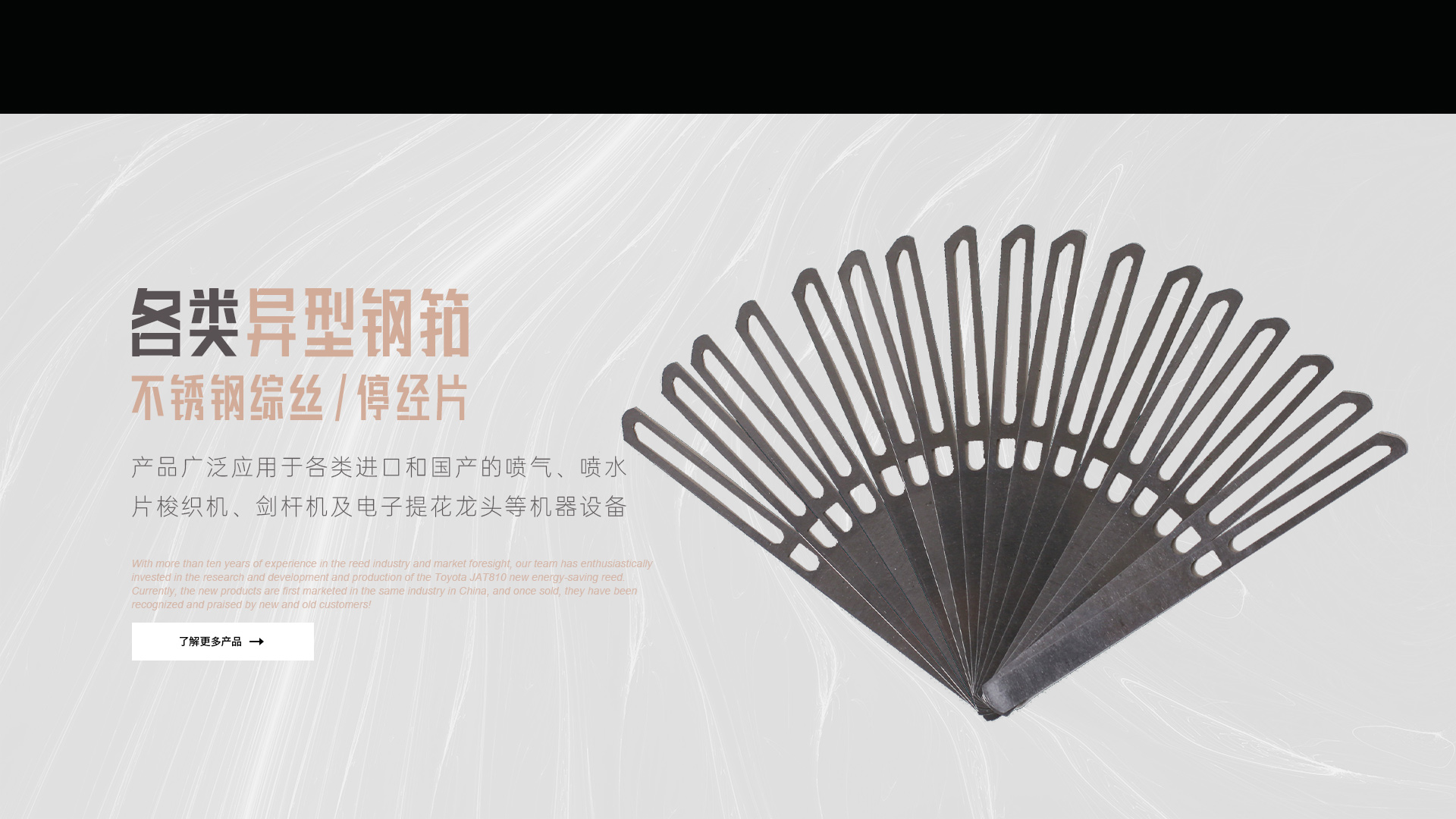 從事研發(fā)生產及銷售各類新型紡織器材的生產型企業(yè)。公司主要產品有:噴氣織機用各類異型鋼筘(傳統(tǒng)型豐田JAT710鋼筘及新研發(fā)的豐田JAT810節(jié)能筘);不銹鋼綜絲及不銹鋼停經片。我們的產品廣泛應用于各類進口和國產的噴氣、噴水、片梭織機、劍桿機及電子提花龍頭等機器設備。